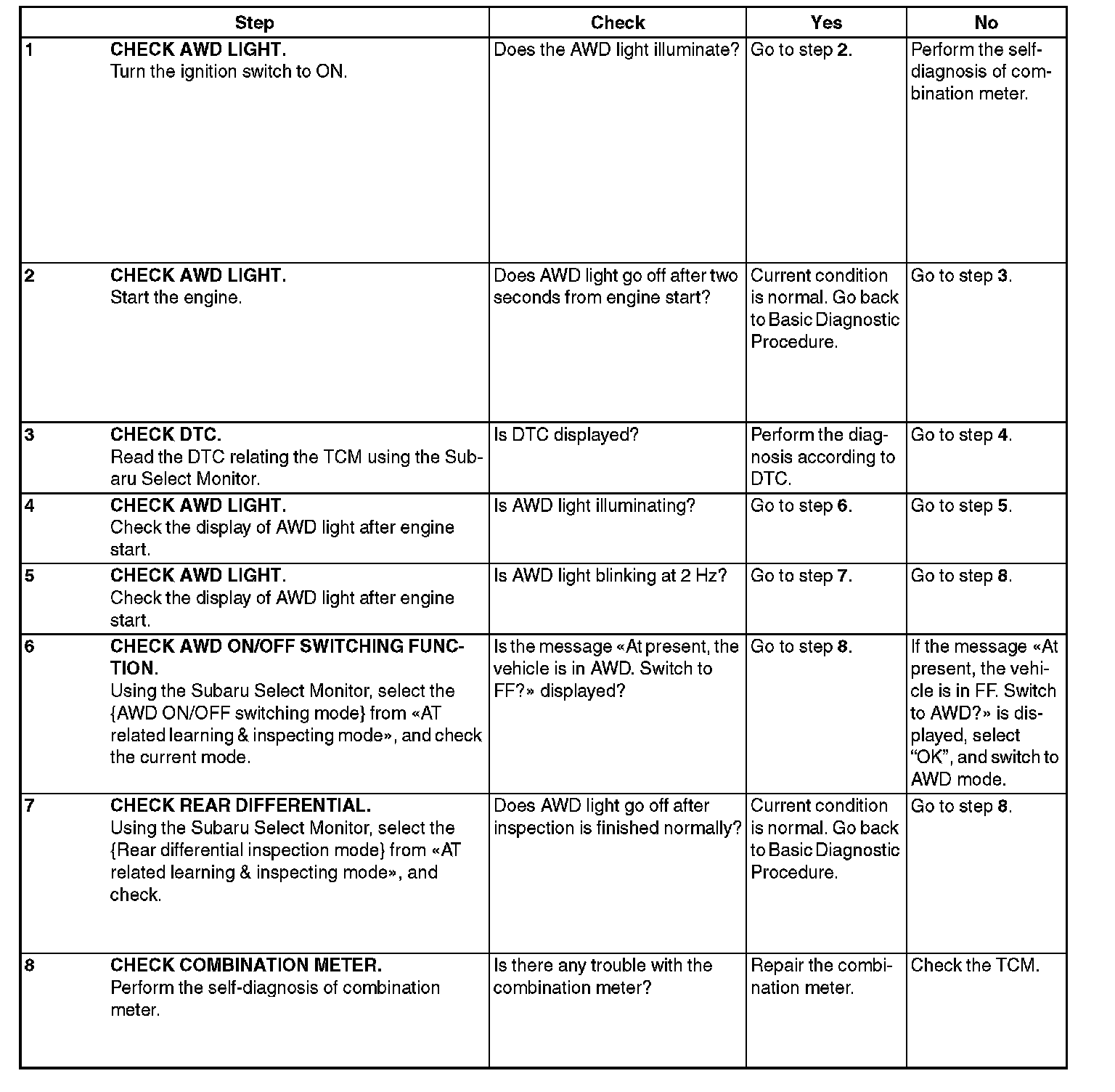 If the AWD light does not illuminate, or illumination patterns are not as above, check the AWD light circuit.