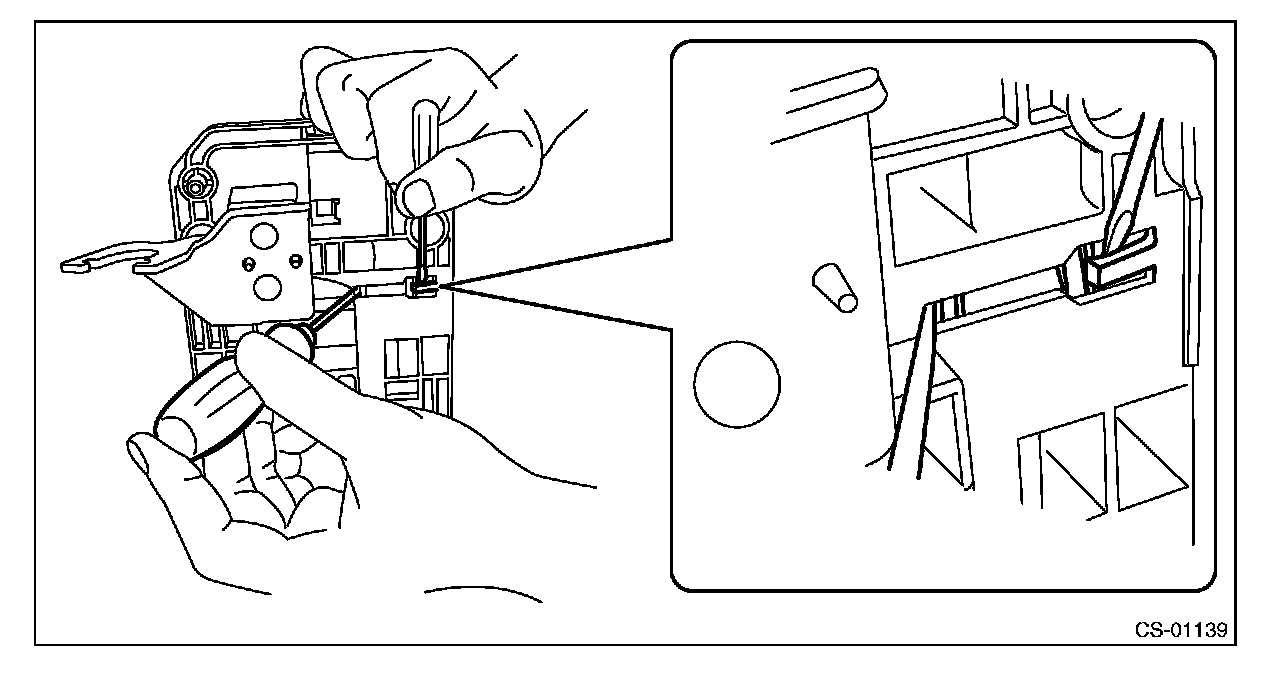 4) Raise the claw using a flat tip screwdriver with a thin tip, and remove the solenoid unit from the plate COMPL.
