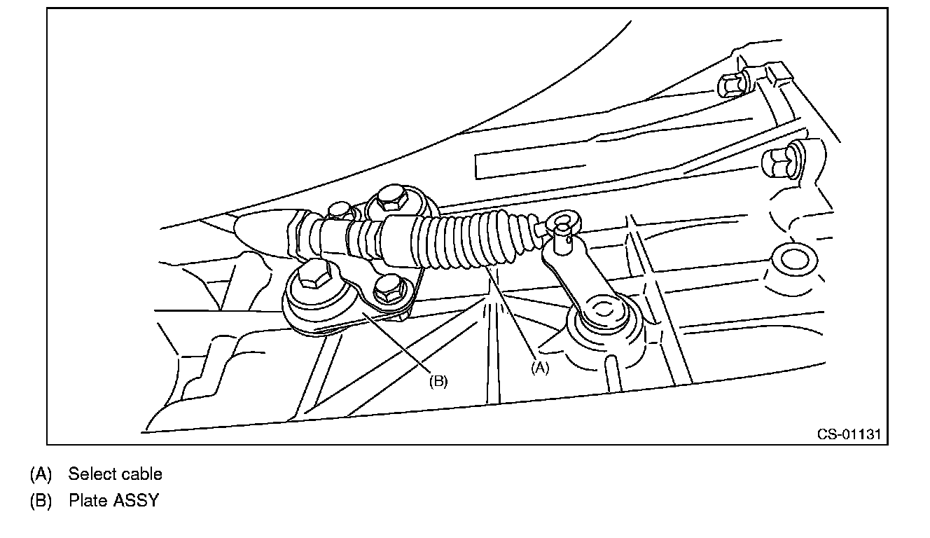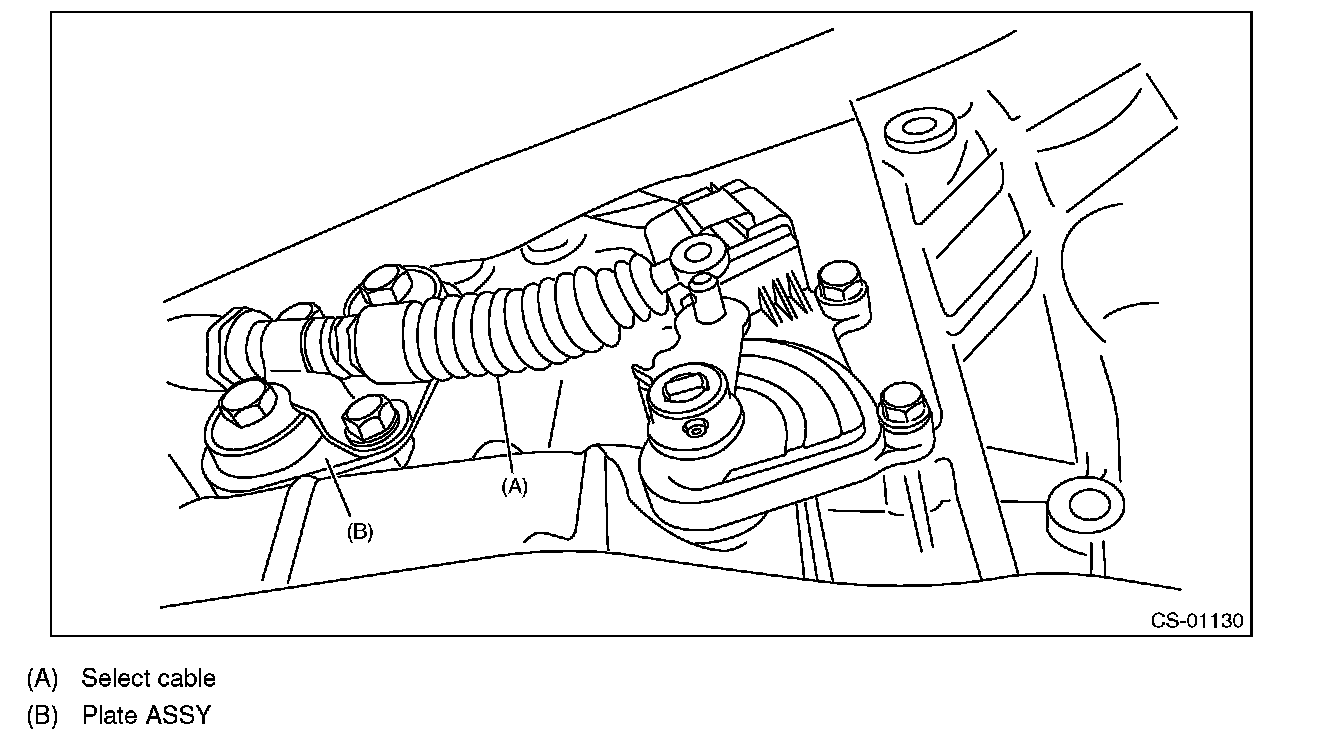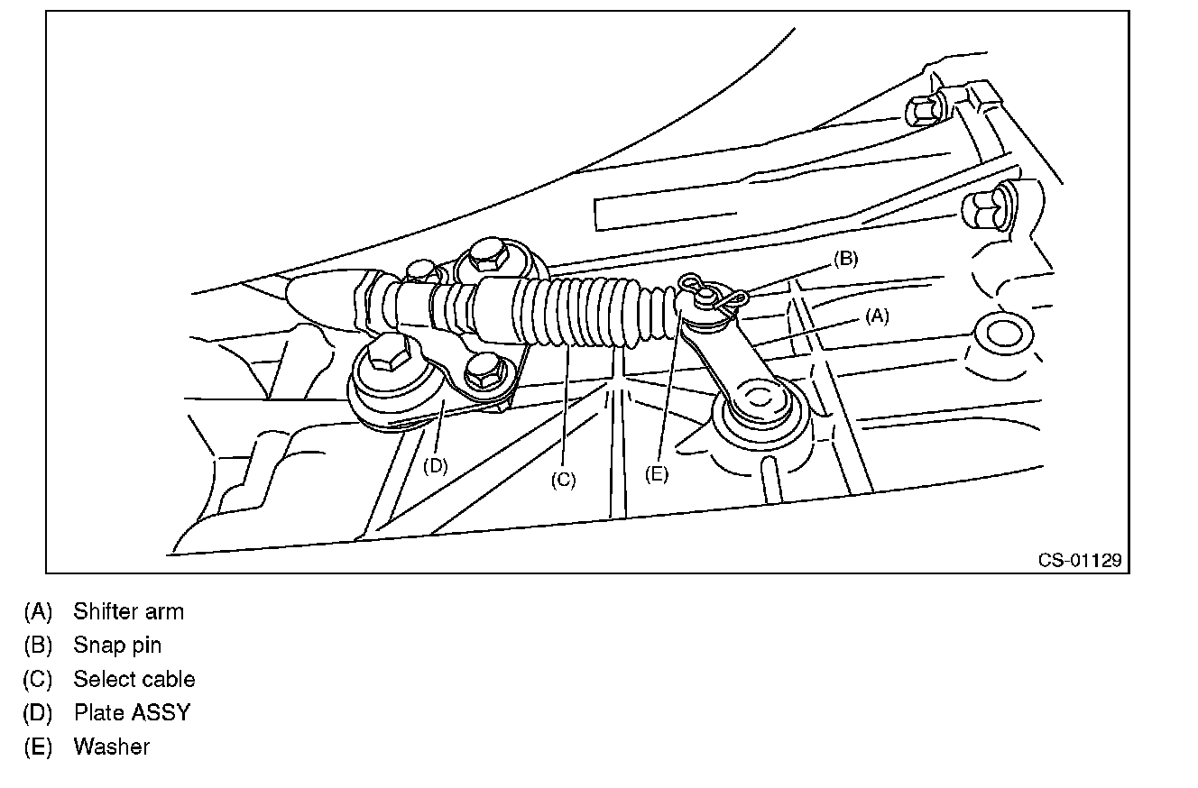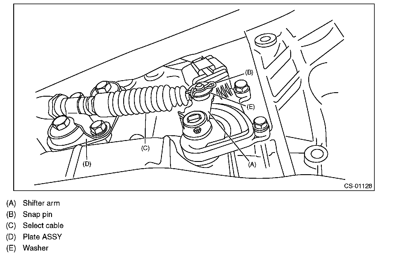 6) Remove the snap pin and washer from the shifter arm and remove the select cable from the shifter arm.