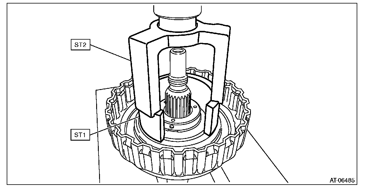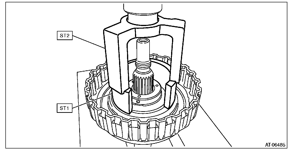 3) Compress the return spring using the ST to remove the snap ring.