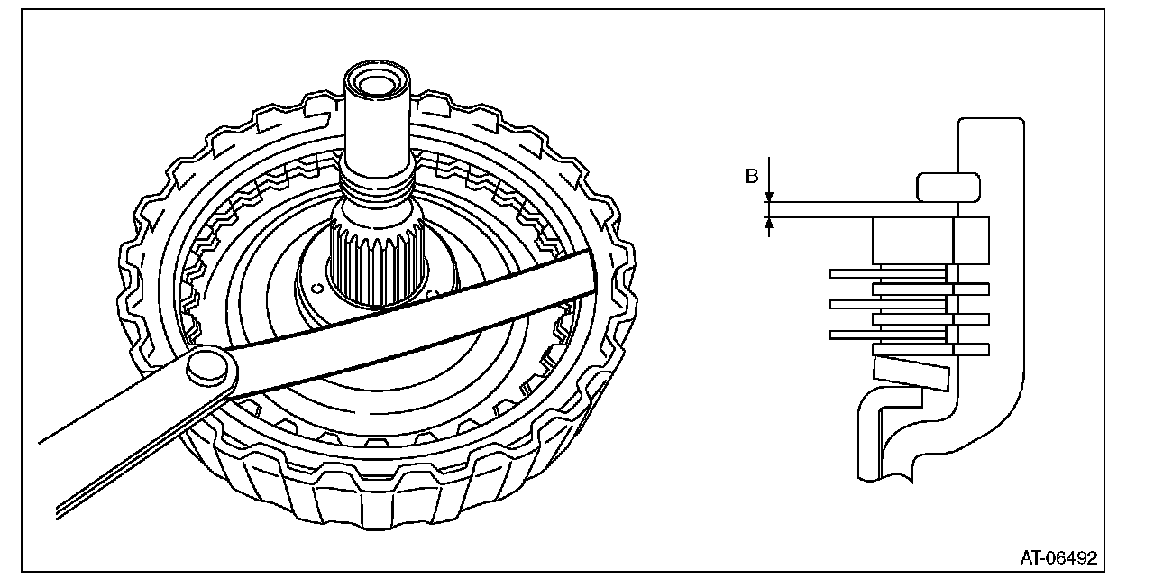13) Measure and record the clearance "B" between the retaining plate and snap ring.