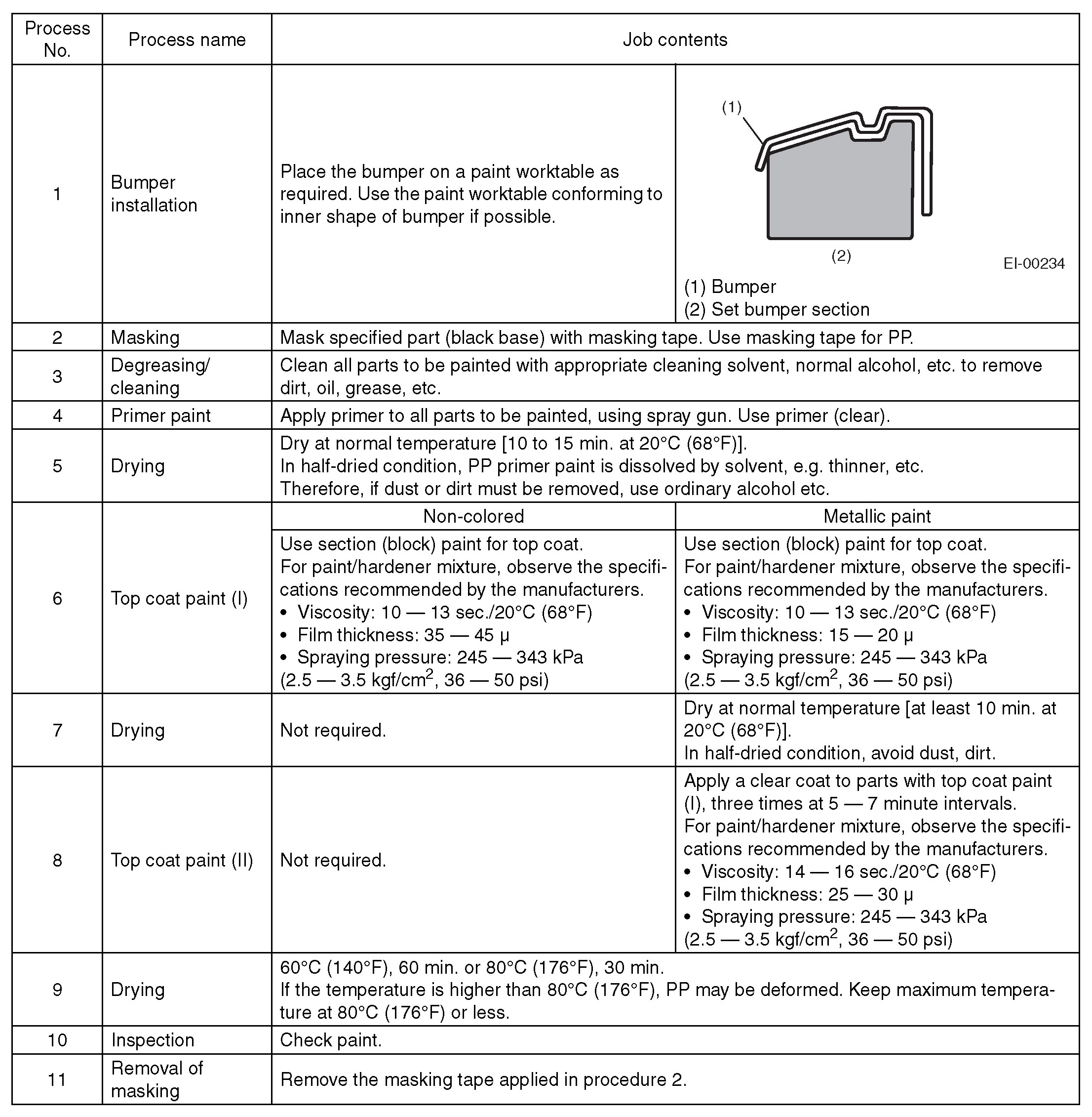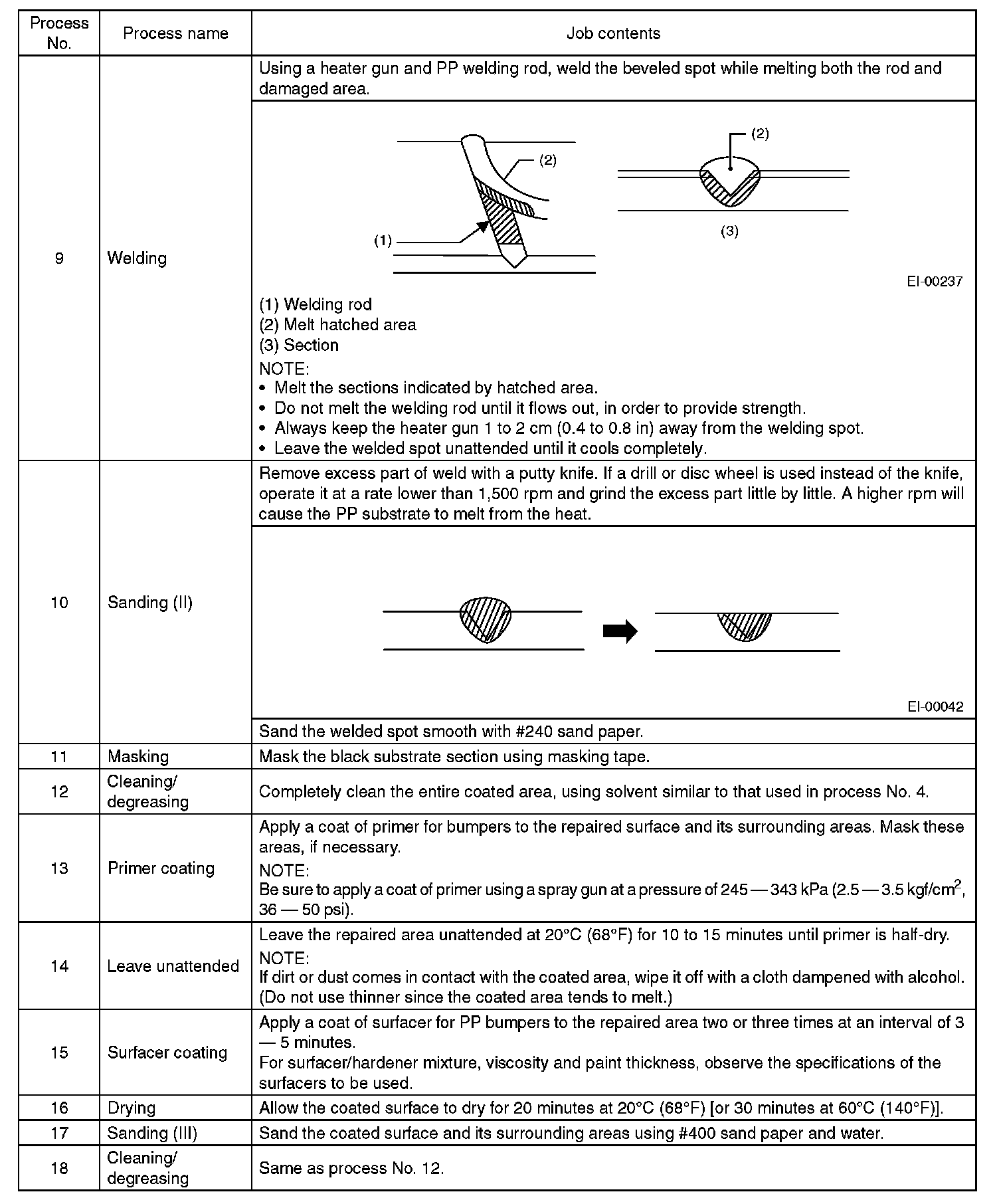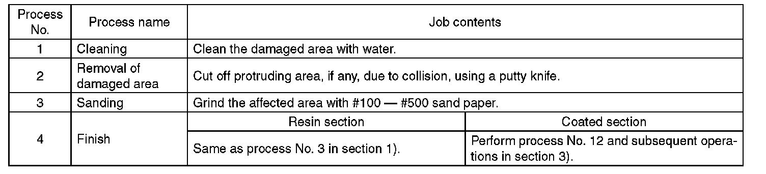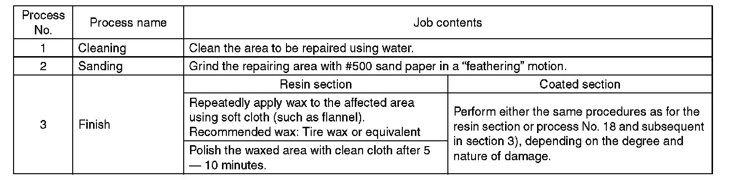 NOTE: All PP bumpers are provided with a grained surface, and if the surface is damaged, it cannot normally be restored to its former condition. Damages limited to the shallow scratches that cause only a change in the luster of the base material or coating, can be almost fully restored. Before repairing a damaged area, explain this point to the customer and obtain an understanding about the matter.