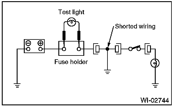 Connect a test light (rated at approx. 3 watts) in place of the blown fuse and allow current to flow through the circuit. Disconnect one connector at a time from the circuit. Starting with the one located farthest from the power supply. If the test light goes out when a connector is disconnected, the wiring between that connector and the next connector (farther from the power supply) is shorted.