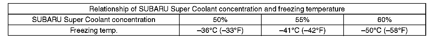 Use the SUBARU Super Coolant with a 50 - 60% concentration in order to obtain maximum antifreeze and anti-rust performance.