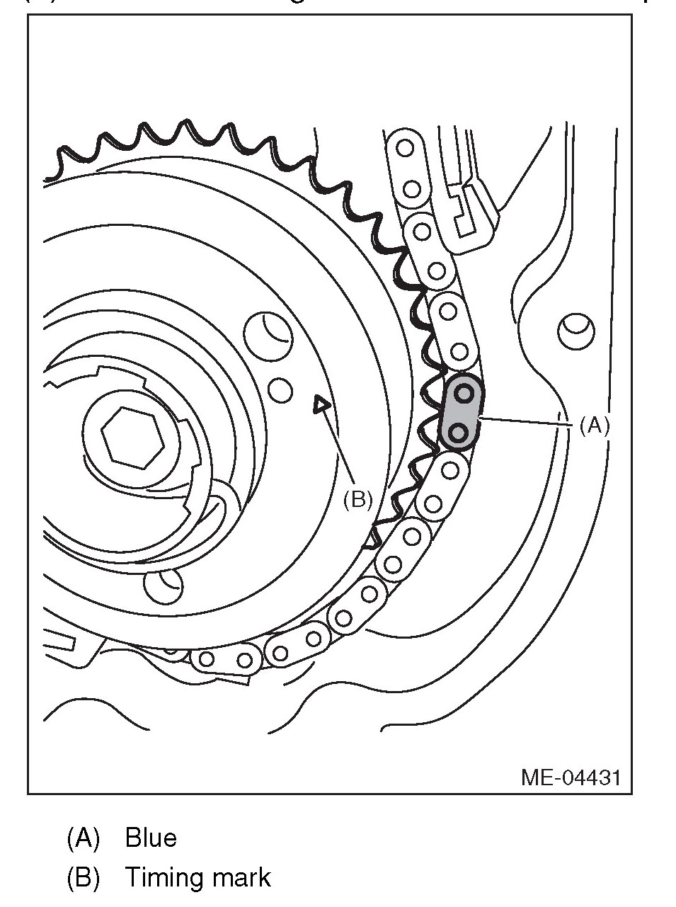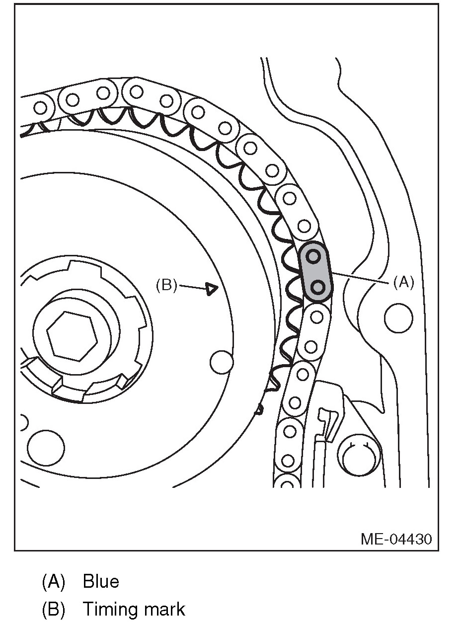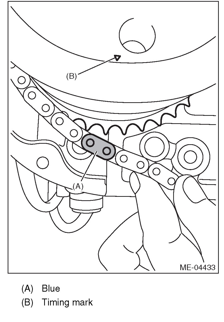 (3) Make sure that the LH side cam sprocket timing mark is aligned to the timing chain mark (blue).