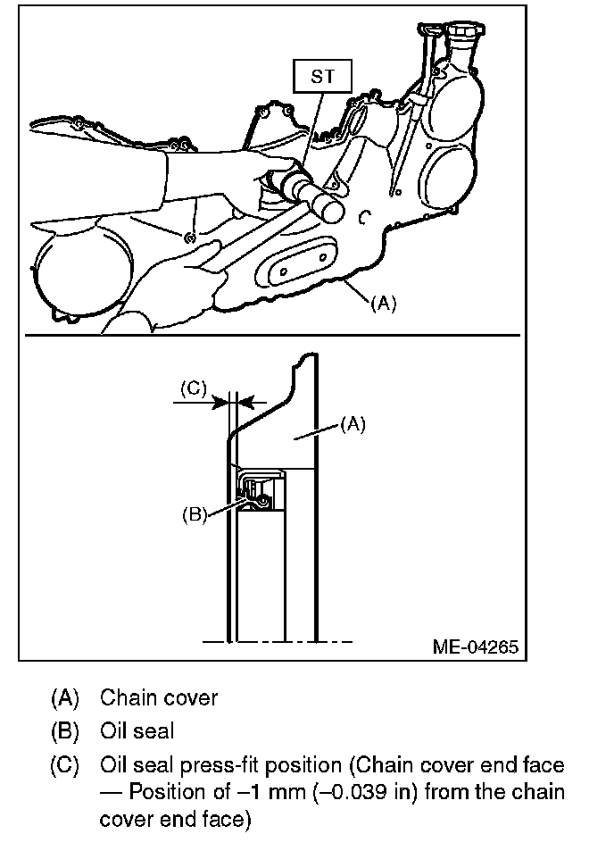 2) Check for oil leakage on the chain cover mating surface and installation part of crank pulley. If there is an oil leak from the oil seal, perform replacement with a new oil seal.
