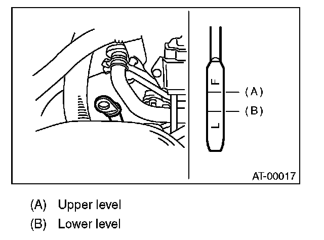 5) Remove the oil level gauge again, and check the level of differential gear oil. If the oil level is below "L" line, add oil to bring the level up to "F" line.