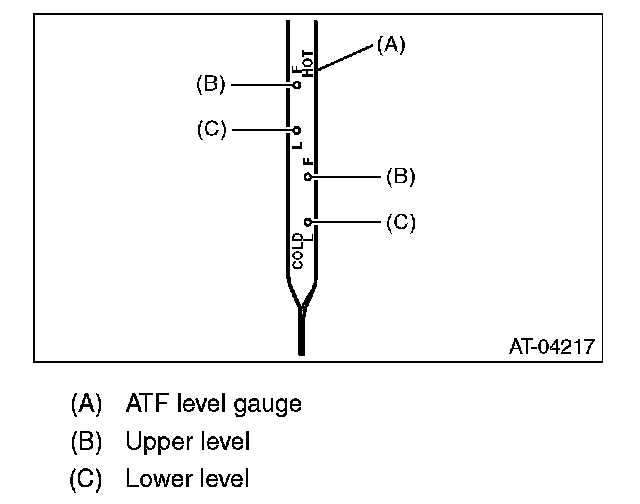 6) Remove the oil level gauge again and make sure that the ATF level is between upper and lower marks of the HOT side.