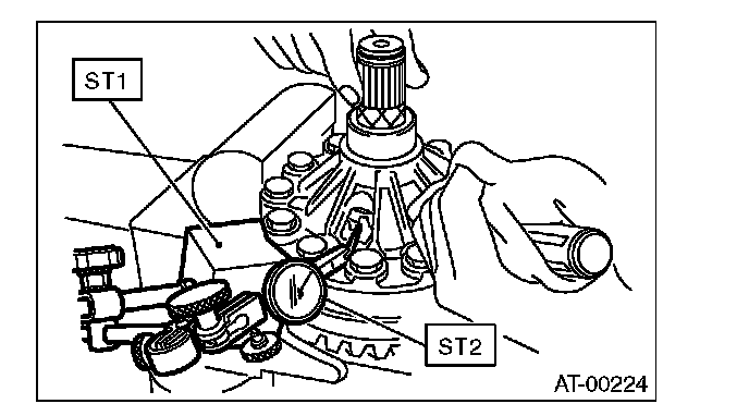 (2) Measure the gear backlash with ST1 and ST2. Insert ST2 from the access window of the differential case.