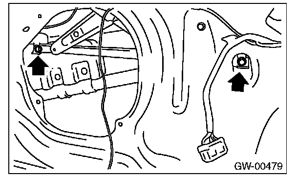 4. Operate the power window switch to move the glass to the position shown in the figure, and then remove the two bolts through service holes.