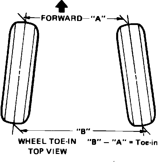 Toe is the turning in or out of the front wheels, Fig. 2. The purpose of toe is to ensure parallel rolling of the front wheels. Excessive toe-in or toe-out may increase tire wear. Amount of toe can be obtained by subtracting ``A'' from ``B'' as shown in Fig. 2, and is given in inches or millimeters.