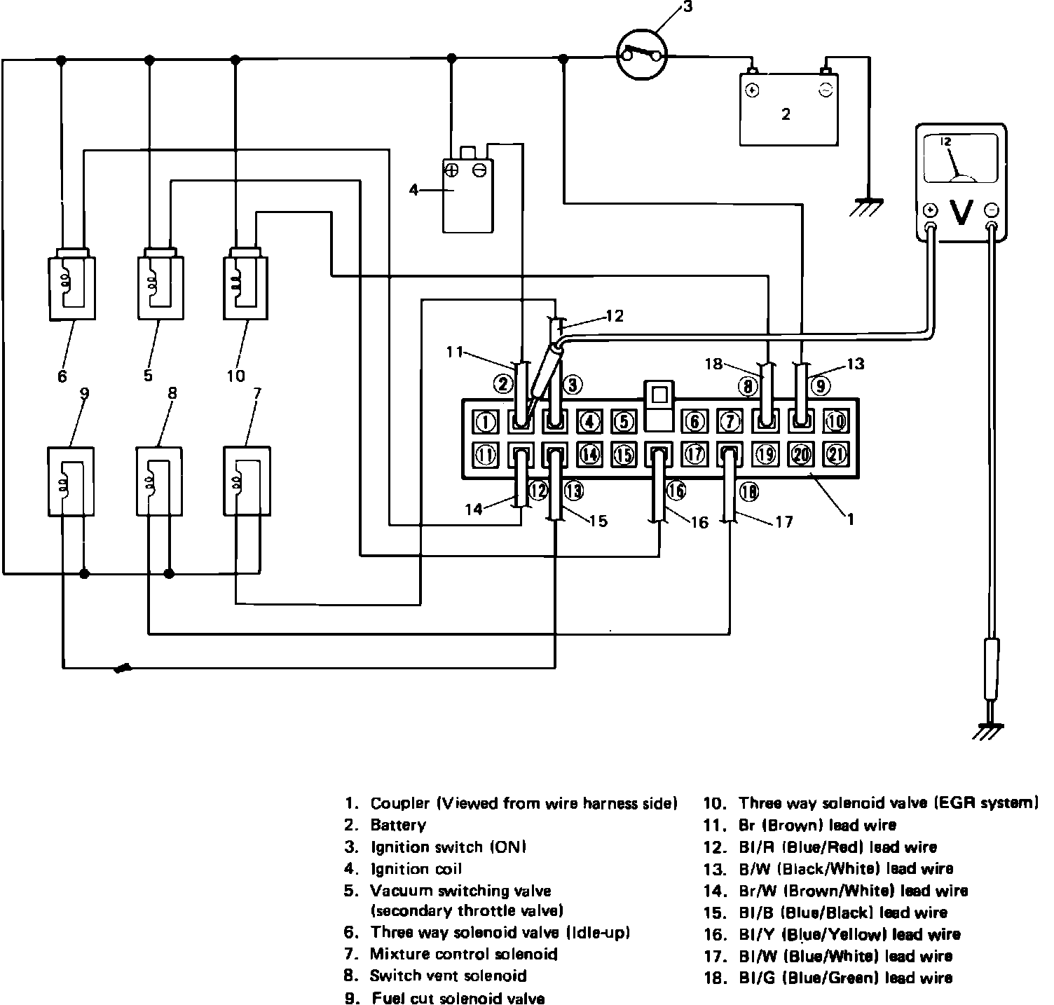 The ignition coil, solenoids and solenoid valves are all connected to the ECM. A loose or open connection in any of these circuits will cause a loss of signal to the ECM, thus causing the system to malfunction. Check all power circuits as follows: