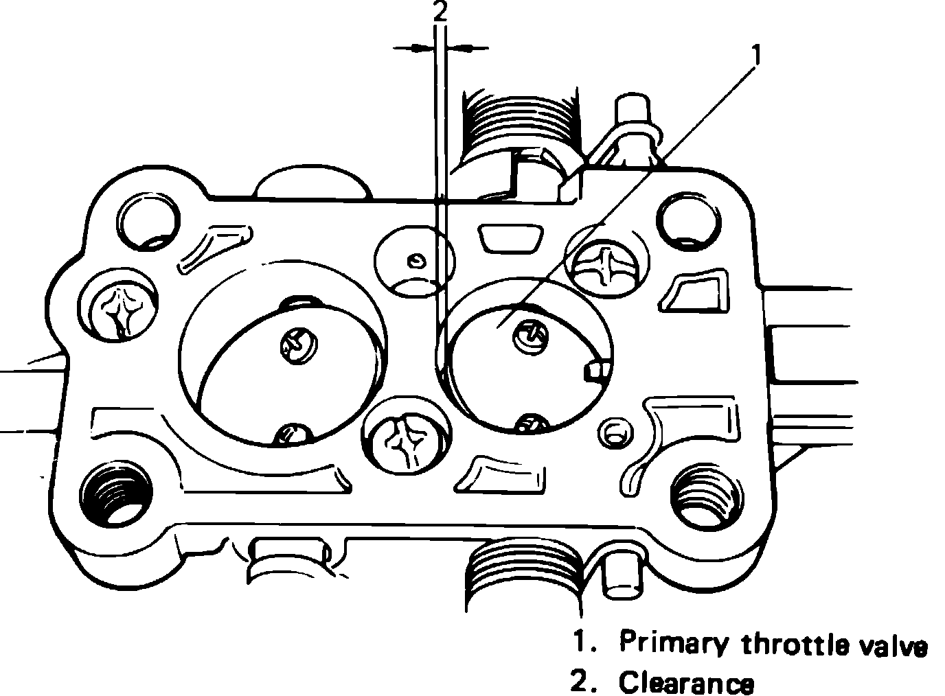 5. Open throttle valve slowly till throttle valve to carburetor bore clearance is .014-.024 inch (9.36-.62 mm), Fig. 6. and ohmmeter reading moves from zero to infinity.