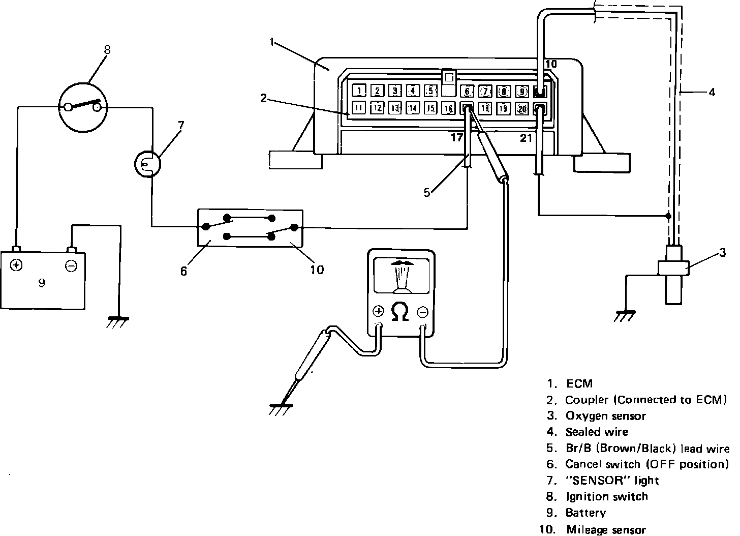 b. Check that ohmmeter needle deflects, which means that ECM is sending feed back signal. Turn on cancel switch in fuse box to check if sensor lamp flashes. If not, check if bulb is burned out.