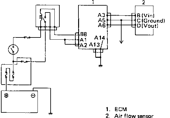 4. Turn ignition switch On, check if battery voltage is present. If battery voltage is not present, check wire harness for open or poor connection at A3 and A5 terminals of ECM.