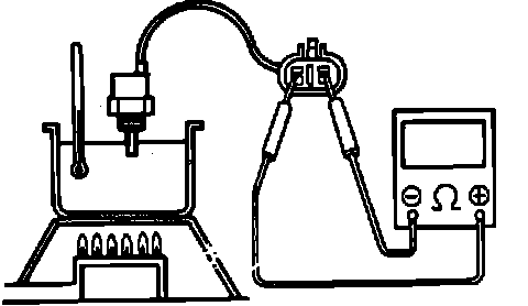 3. Using a suitable ohmmeter, measure resistance between sensor terminals, Fig. 126, while heating water gradually. Refer to ``Sensor Specifications'' for resistance readings. If resistance readings are not as specified, replace sensor.