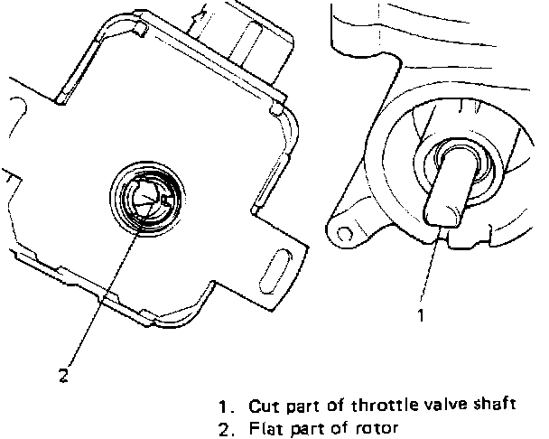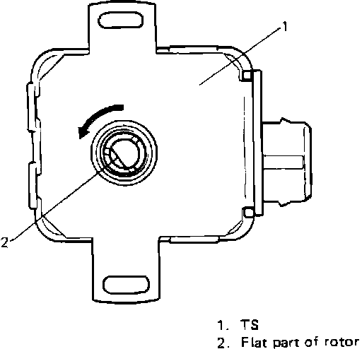 1. Install TS to throttle body. Before installation, check to make sure that flat part of TS rotor is positioned as shown. If not turn rotor with finger counterclockwise till it stops.