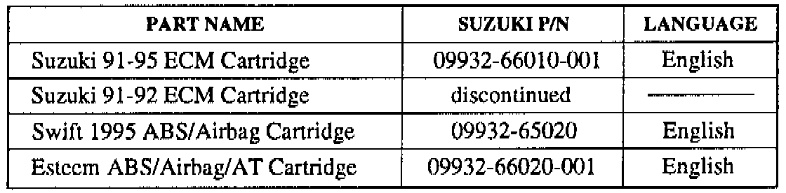 ^ THE 1991-1994 SUZUKI CARTRIDGE (09932-66010-001) MAY BE USED ON 1995 MODEL VEHICLES IF YOU ENTER 1994 IN THE TECH 1-A FOR THE YEAR OF THE VEHICLE.