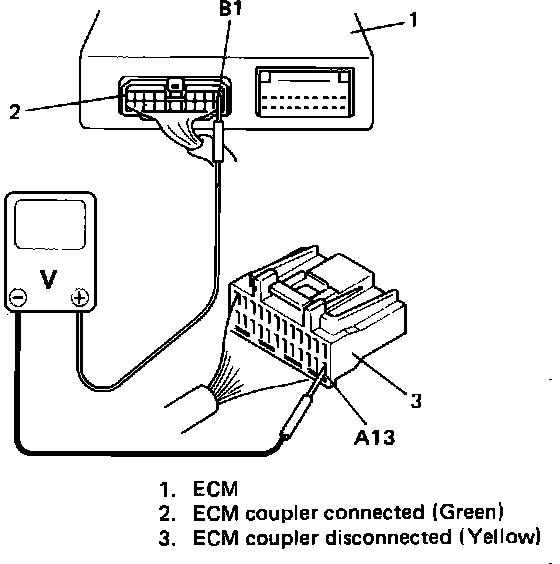 - Connect voltmeter between "B1" terminal of green connector (connected) and "A13" terminal of yellow connector (disconnected).