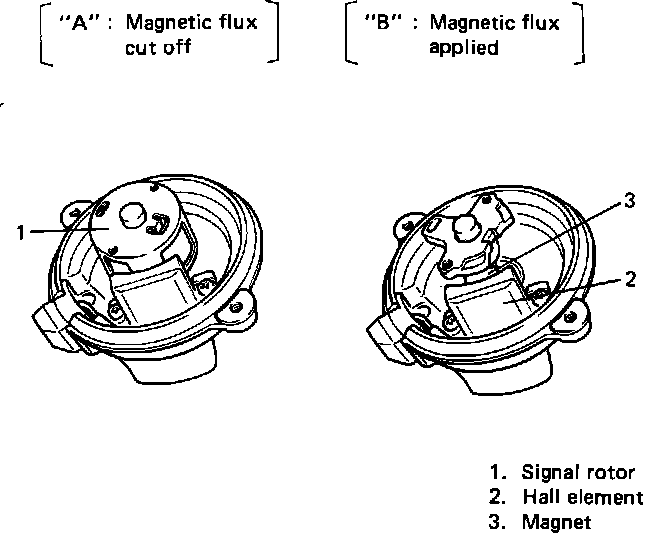 - Check voltage with signal rotor inserted between hall element and magnet ("A") and without it ("B") respectively.