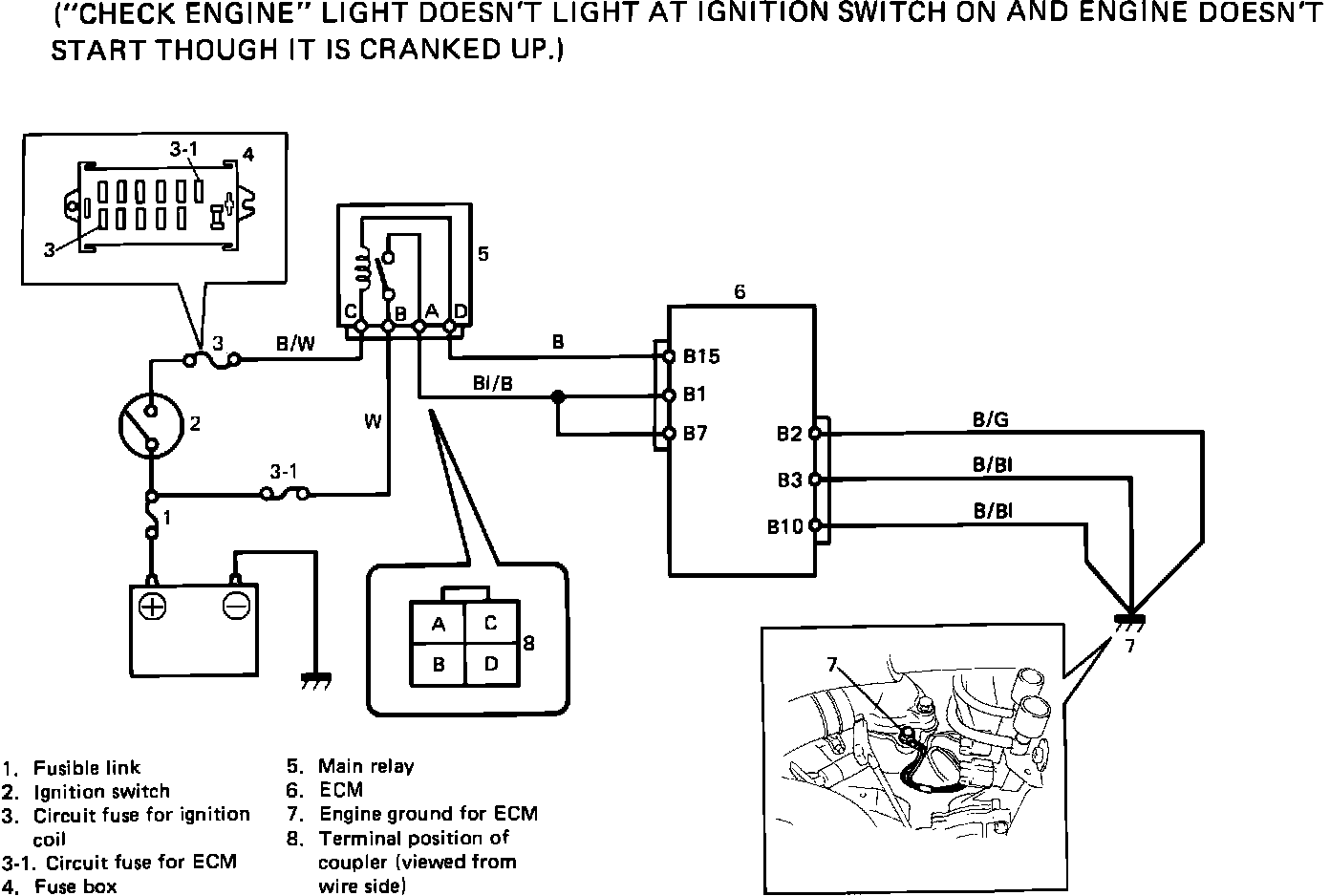 Check engine light doesn't light with key on and engine does not start.