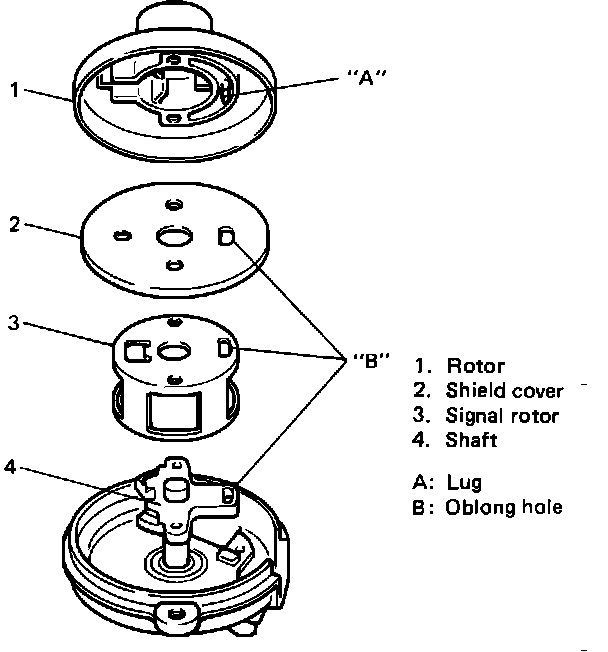 ^ When installing signal rotor, shield cover and rotor to shaft, be sure to fit lug "A" on rotor in oblong holes "B" in cover, signal rotor and shaft.