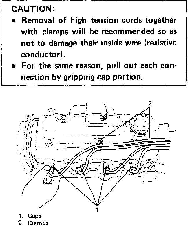 - Pull out high tension cords by gripping their caps and then remove spark plugs.