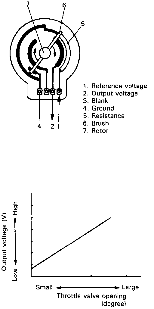 The throttle position sensor is connected to the throttle valve shaft on the throttle body, and detects the throttle valve opening. The throttle opening is detected by the potentiometer as follows. A 5-volt reference voltage is applied to the sensor from ECM and as its brush moves over the print resistance according to the throttle valve opening, the output voltage varies accordingly. By monitoring sensor output voltage, ECM detects the throttle valve opening. ECM uses the signal from TP sensor as one of the signals to control fuel injector, ISC actuator and EGR solenoid vacuum valve. Also, ECM converts the voltage signal from TP sensor into ON/OFF signal and sends it to transmission control module, where it is used as one of the signals to control the automatic transmission.