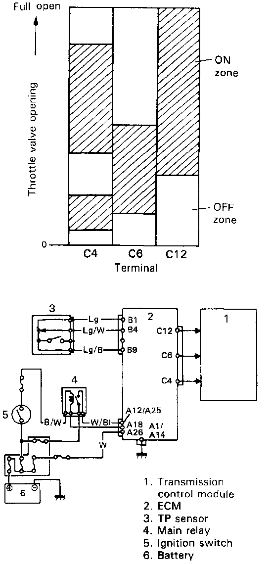 Receiving the throttle valve opening signal from the throttle position sensor, ECM converts it into the three ON/OFF signals and sends their signals to transmission control module through C12, C6 and C4 terminals. Then transmission control module uses them as the signals to control the automatic transmission.