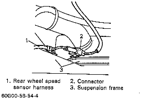 3. Disconnect rear wheel speed sensor connector and detach connector and wire harness from suspension frame.