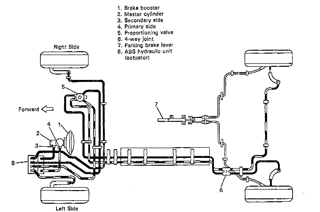 The proportioning valve (P valve) is included in these circuits between the master cylinder and rear wheels. In brake system of this model, the disc brake type is used of the front wheel brake and a drum brake type (leading/trailing shoes) for the rear wheel brake.