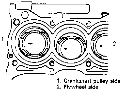3. When installing piston and connecting rod assembly into cylinder bore, point arrow mark on piston head to crankshaft pulley side.