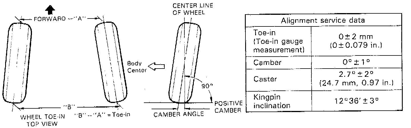 Should camber or caster be found out of specifications upon inspection, locate its cause first. If it is in damaged, loose, bent, dented or worn suspension parts, they should be replaced. If it is in vehicle body, repair it so as to attain specifications.