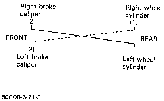 Hydraulic lines of brake system are based on the diagonal split system. When a brake pipe or hose was disconnected at the wheel, bleeding operation must be performed at both ends of the line of the removed pipe or hose. When any joint part of the master cylinder or other joint part between the master cylinder and each brake (wheel) was removed, the hydraulic brake system must be bled at all 4 wheel brakes.