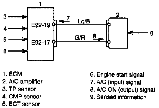 This signal is sent from the A/C amplifier. The A/C amplifier outputs this signal to ECM when A/C ON conditions are satisfied on the A/C amplifier side. (The air conditioner does not turn ON in this state.) When ECM detects through the A/C signal that A/C ON conditions are satisfied on the A/C amplifier side, it uses the A/C signal as one of the factors to Output A/C ON signal and to control idle air control valve.
