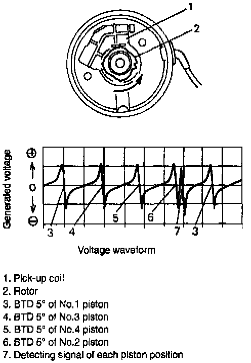 The camshaft position sensor located in the distributor consists of the signal generator (pick-up coil and magnet) and signal rotor. As the signal rotor turns, AC voltage is generated in the pick-up coil which varies in pulsatory way as shown. This pulse signal (5 pulses/revolution) is sent to ECM where it is used to calculate the engine speed and the piston position of each cylinder and that information is also used as one of the signals to control various devices.