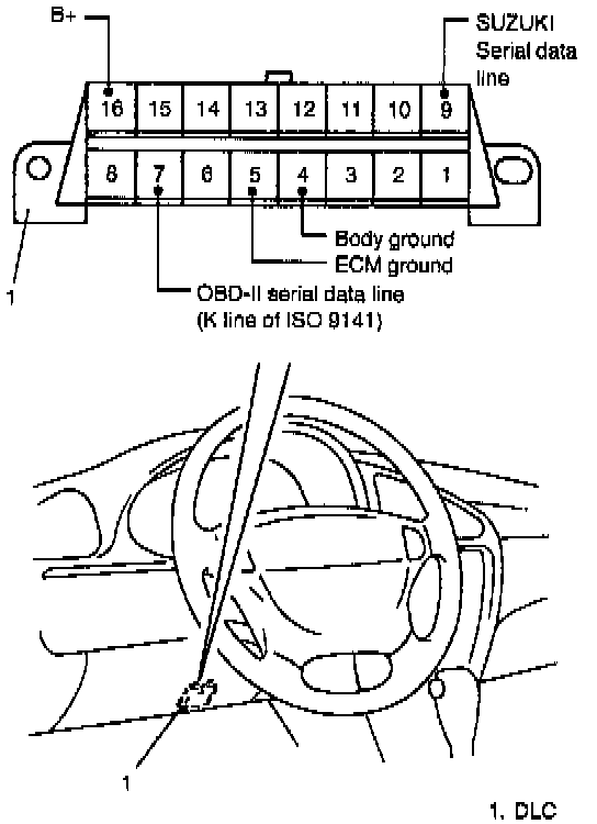 DLC is in compliance with SAE J1962 in its installation position, the shape of connector and pin assignment. OBD-II serial data line (K line of ISO 9141) is used for SUZUKI scan tool (Tech-1) or OBD-II generic scan tool to communicate with ECM. SUZUKI serial data line is used for SUZUKI scan tool (Tech-1) to communicate with an electronic control unit other than ECM (Airbag SDM, ABS control module, etc.).