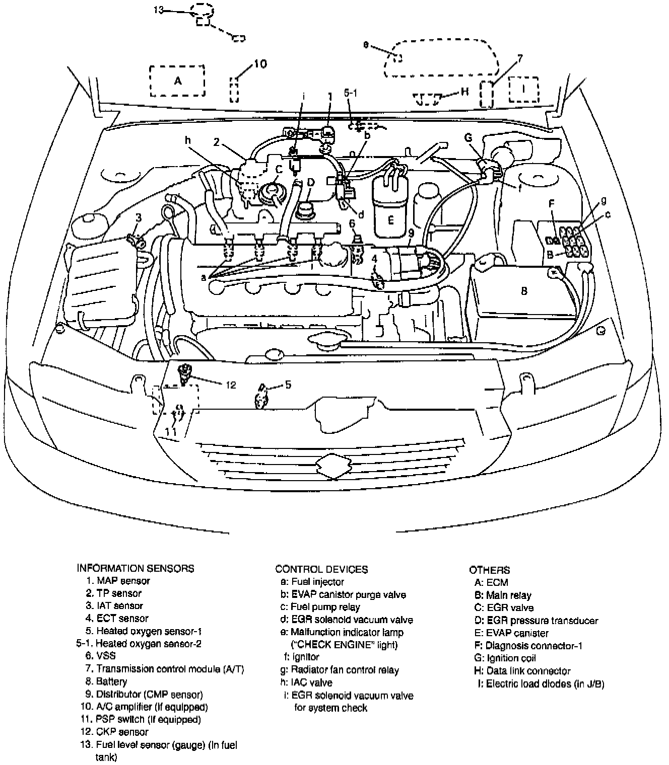 The electronic control system consists of 1) various sensors which detect the state of engine and driving conditions, 2) ECM which controls various devices according to the signals from the sensors and 3) various controlled devices. Functionally, it is divided into nine sub systems:- Fuel injection control system
