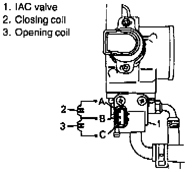 7. Connect 12V-battery positive cable to IAC valve B terminal and negative cable to IAC valve C terminal and check that air can be blown into air hose. If check result is not satisfactory, check IAC valve air passage. If air passage is OK, replace IAC valve.