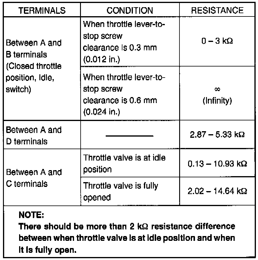 1. Disconnect negative cable at battery and coupler from TP sensor.2. Using ohmmeter, check resistance between terminals under each condition given in table above. If idle switch check result is not satisfactory, adjust installation angle of TP sensor and if found defective in the other check, replace TP sensor.