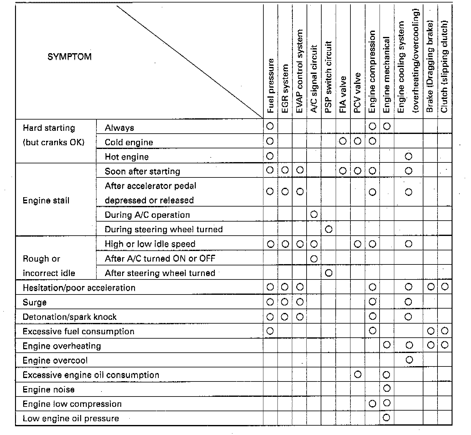 SYMPTOM-TO-DIAGNOSIS MATRIX TABLEPerform troubleshooting referring to following table when Electronic Control Module (ECM) has detected no Diagnostic Trouble Code (DTC) and no abnormality has been found in visual inspection and engine basic inspection previously.