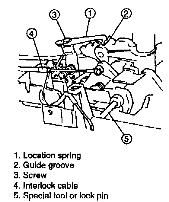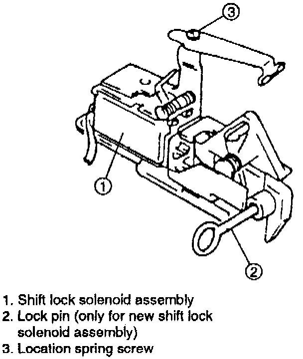 When installing or adjusting the new shift lock solenoid assembly, select lever, or brake interlock cable, please follow the instructions as listed in this bulletin.After installing the new shift lock solenoid assembly, be sure to remove the lock pin.