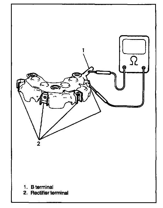 1. Using an ohmmeter, connect one tester probe to the B terminal and the other to each rectifier terminal.