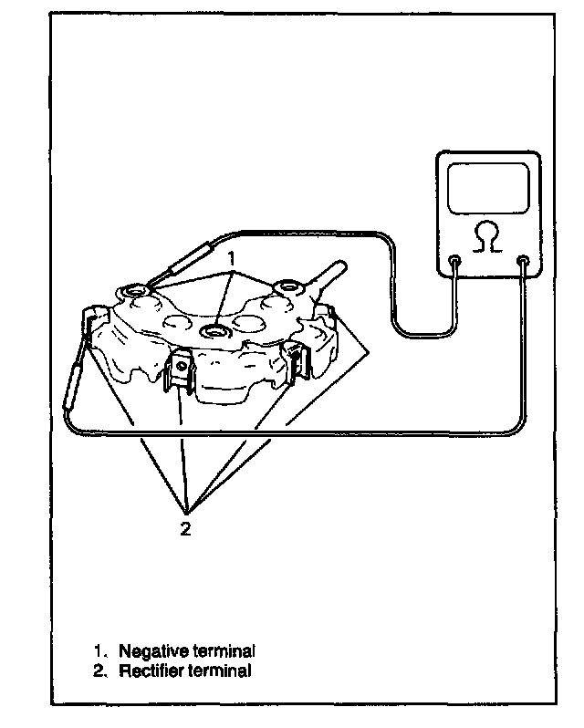 1. Using an ohmmeter, connect one tester probe to each negative terminal and the other to each rectifier terminal.
