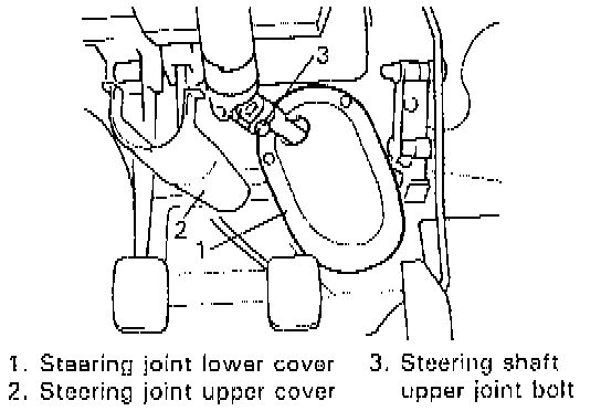 ^ Steering column mounting nuts should not be loosened with steering shaft joint upper side bolt tightened as this could cause damage to shaft joint bearing.