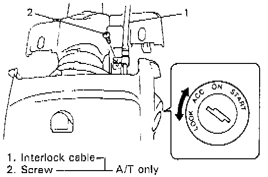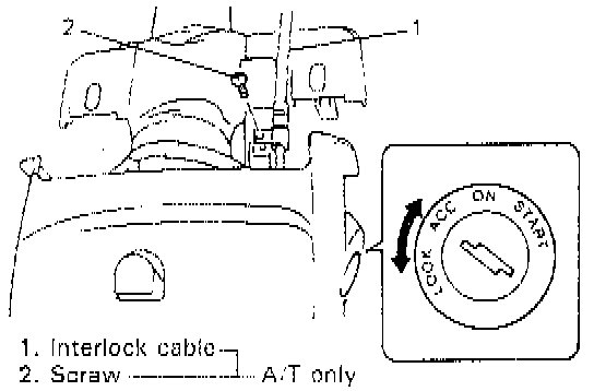 13. With A/T vehicle, remove shift (key) interlock cable screw and then disconnect its cable from ignition switch with ignition switch turned at "ACC" position. After disconnecting, turn ignition switch to "LOCK" position.