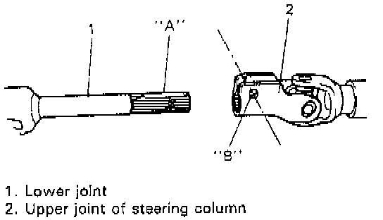 1. Align flat part "A" of lower joint shaft with bolt hole "B" of upper side joint of steering column as shown. Then insert upper side joint of steering column into lower joint shaft.