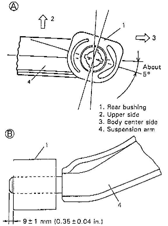 2. Install rear bushing to suspension arm as follows. First, push in rear bushing in such direction and angle as shown in figure (A) and drive it into such position as shown in figure (B).