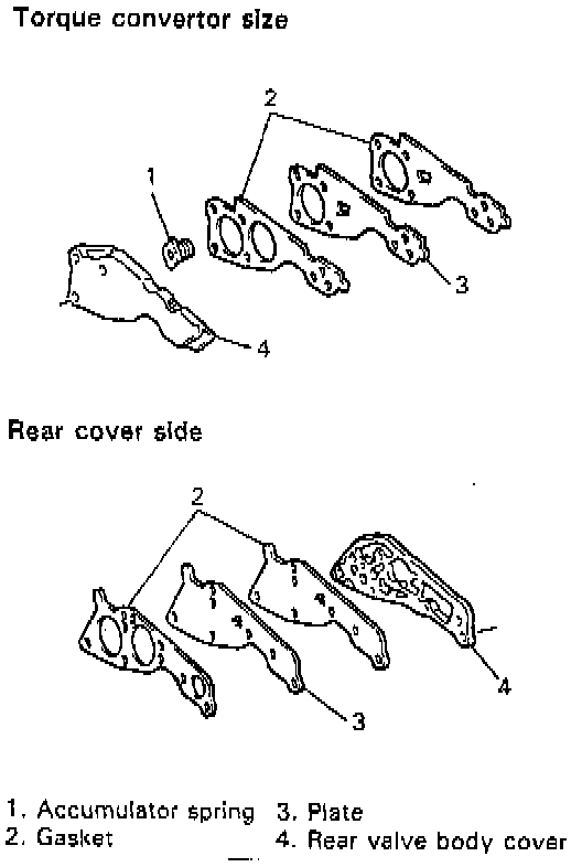 7. Install gaskets, plates and rear valve body covers with check balls and accumulator spring, and then tighten bolts to specified torque.