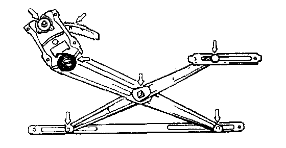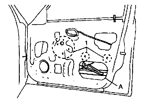 2. Remove window regulator attaching screws (1) (six pcs.). Then, take out regulator through hole (A).